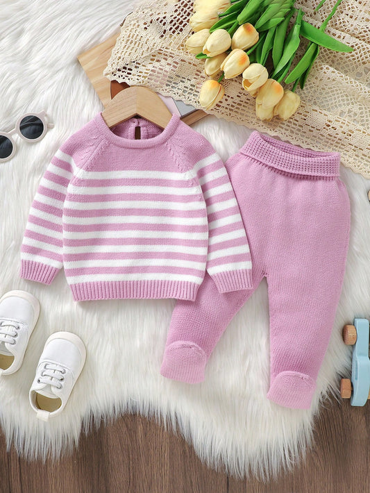 Bebé niña Jersey con patrón de rayas de manga raglán con pantalones tejidos