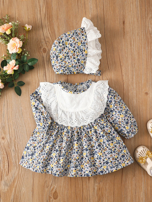 Bebé Vestido floral con bordado con ojal ribete con fruncido con sombrero
