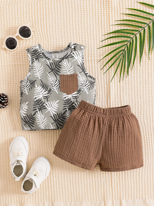 Bebé niño Top tank con estampado tropical con parche de bolsillo & Shorts