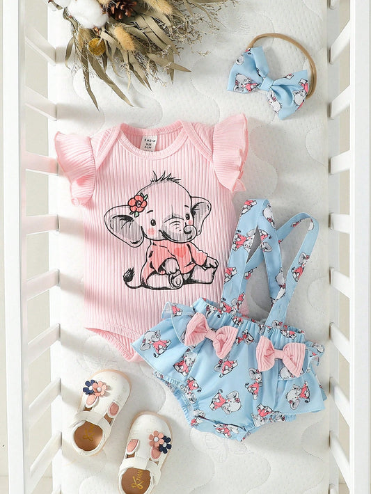 Bebé con estampado de dibujos animados ribete con fruncido Body & con lazo delantero tirantes Shorts con banda cabeza