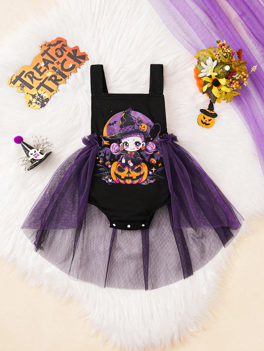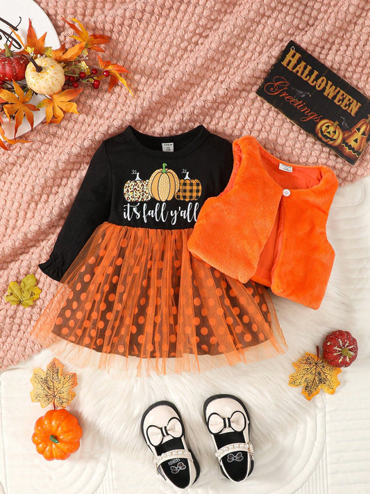 Bebé niña estampado de calabaza de manga amplia Vestido de malla & Cazadora