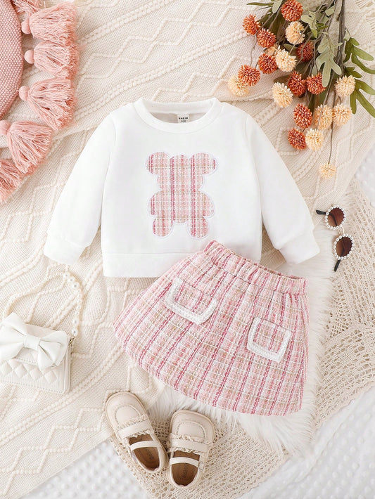 Bebé niña con bordado de oso Sudadera & con estampado de cuadros Falda