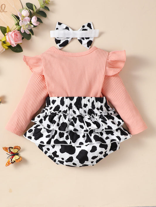 Bebé Body con estampado de vaca lazo ribete con fruncido con banda cabeza