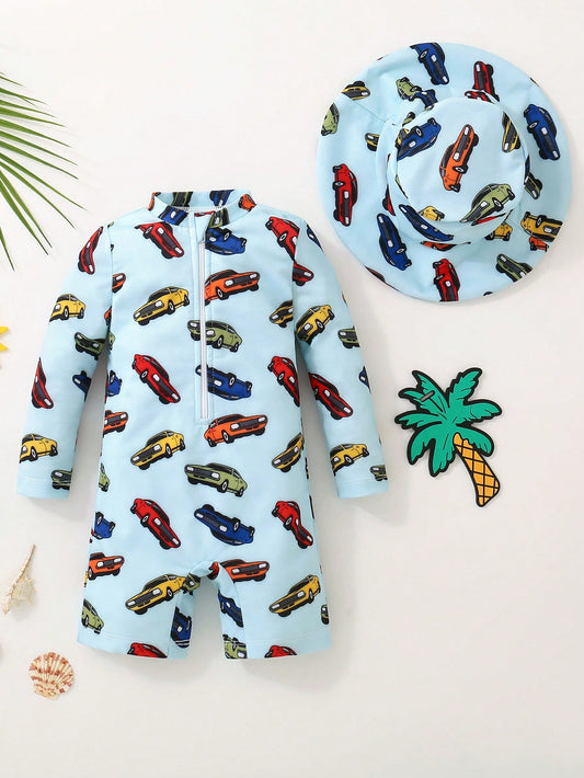 Traje de baño para bebé niño, bañador de manga larga con estampado de dinosaurios lindos y sombrero de sol a juego, adecuado para vacaciones de verano, playa, surf, parque acuático