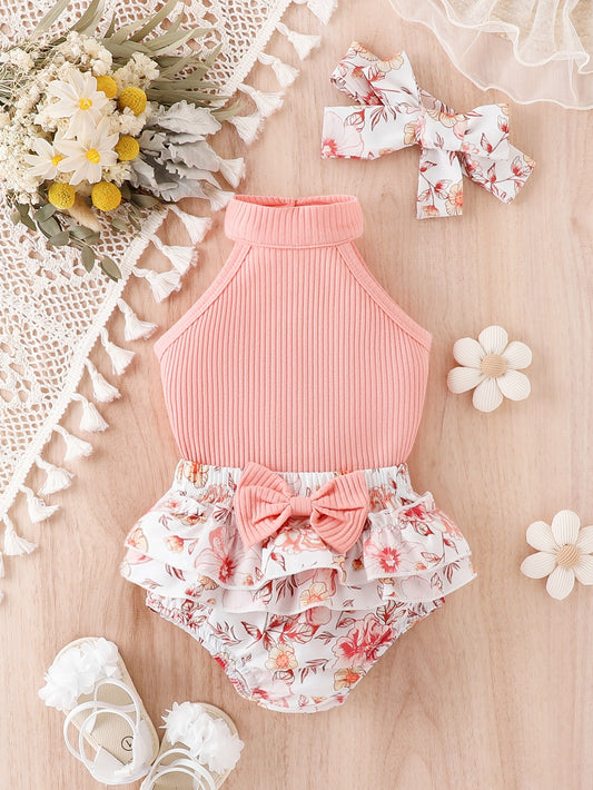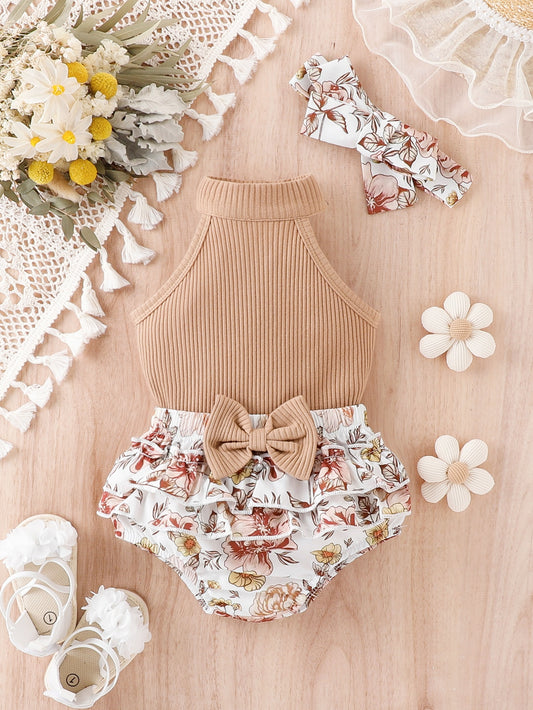 Bebé Top halter tejido de canalé & Shorts con estampado floral con lazo delantero con banda cabeza