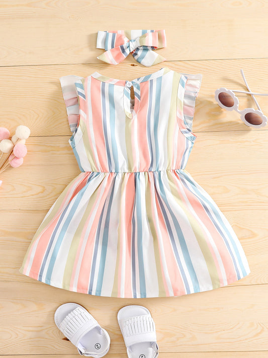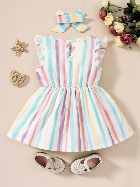 Bebé Vestido de rayas combinadas ribete con fruncido con lazo delantero con diadema