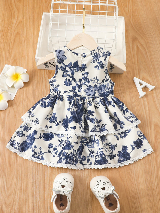 Bebé Vestido con estampado floral ribete con encaje bajo a capas