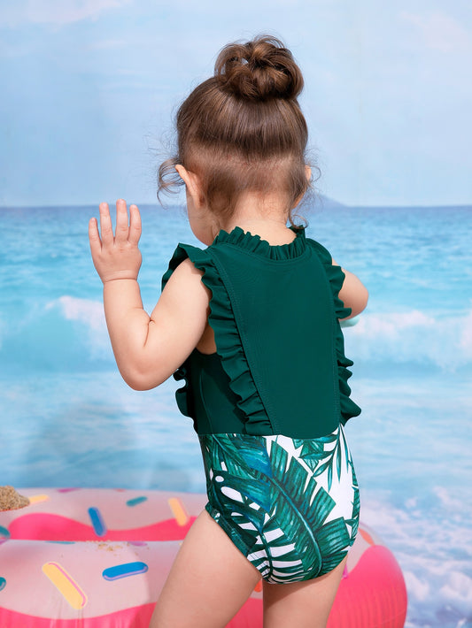 Bebé Bañador una pieza con estampado tropical ribete con fruncido con cremallera media