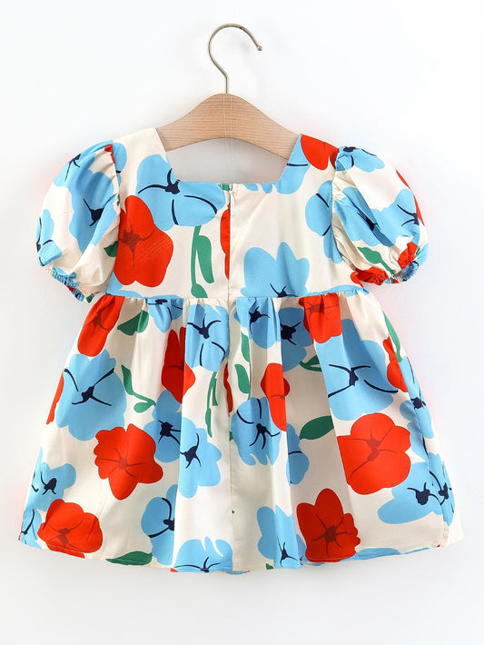 Bebé Vestido lazo grande con estampado floral de cuello cuadrado