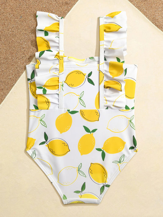 Bebé niña Bañador una pieza con estampado de limón con lazo delantero ribete con fruncido