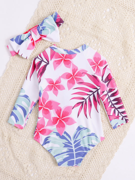 Bebé niña Bañador una pieza con estampado tropical con banda cabeza