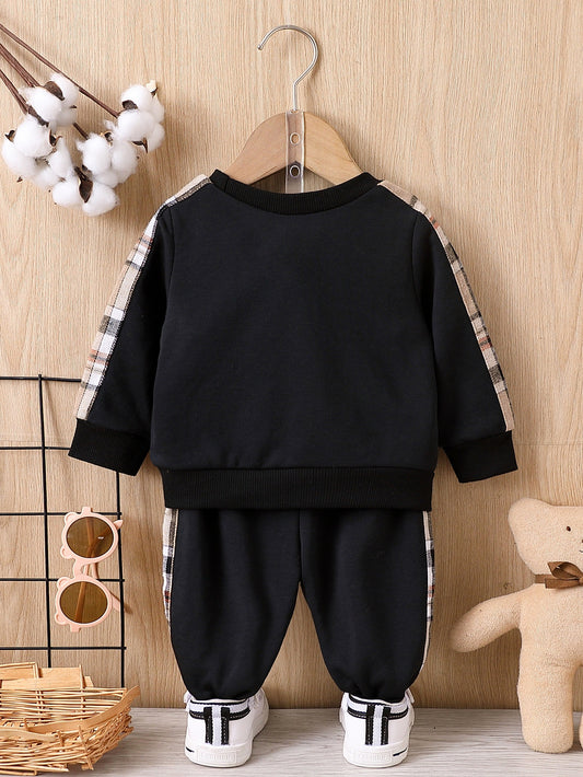 Bebé Pantalones deportivos con sudadera con bordado de oso de cuadros en contraste con costura lateral