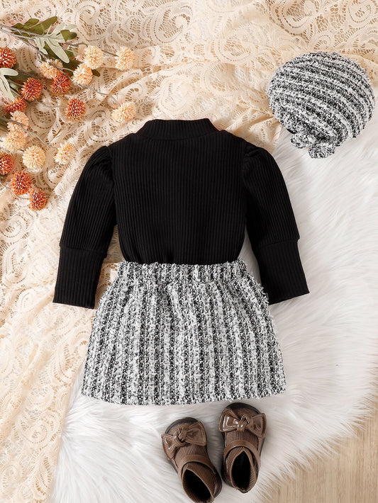 Bebé de cuello alto Camiseta & de cuadros con botón delantero Falda & Sombrero