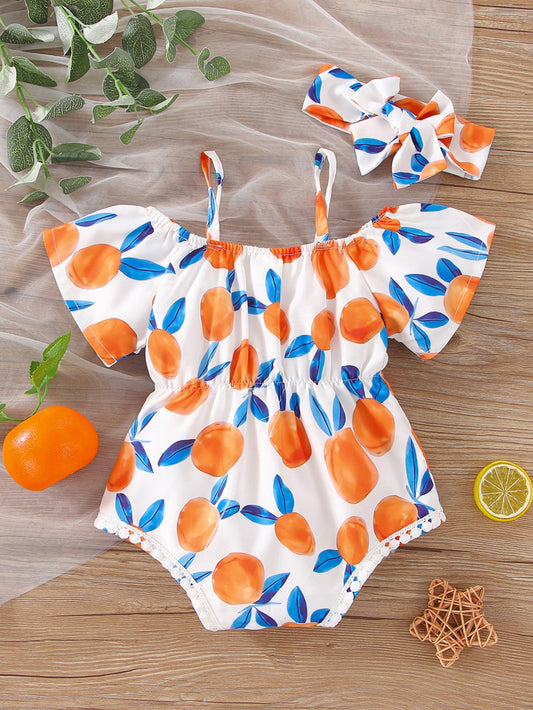 Bebé Body con estampado de fruta con encaje en contraste de hombros descubiertos con diadema