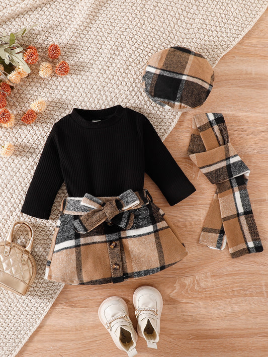 Bebé Body tejido de canalé & Falda con estampado de cuadros con cinturón