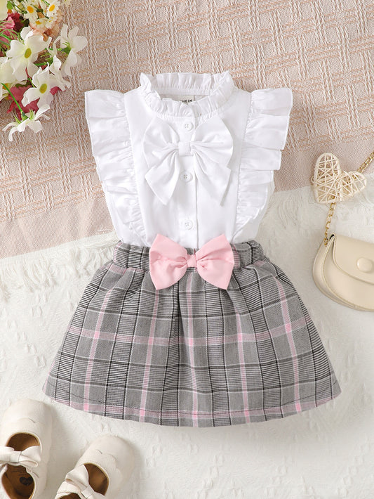 Bebé ribete con fruncido Blusa & con lazo delantero con estampado de cuadros Falda