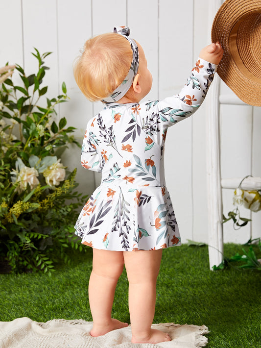 Bebé niña Bañador una pieza con estampado de planta con cremallera delantera con banda de pelo