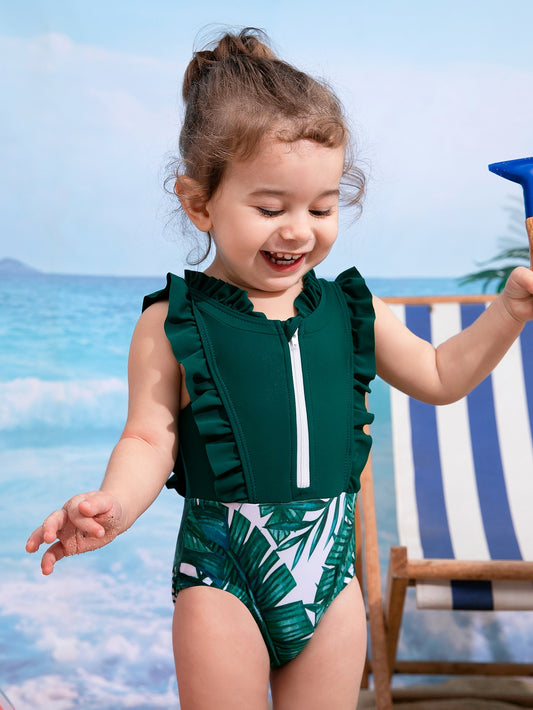 Traje De Baño De Una Pieza Con Media Cremallera Para Niñas Pequeñas Con Estampado Tropical Y Volantes
