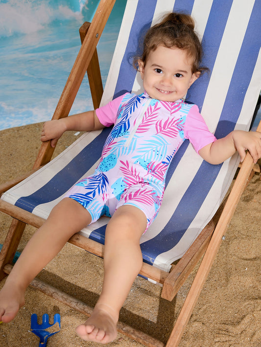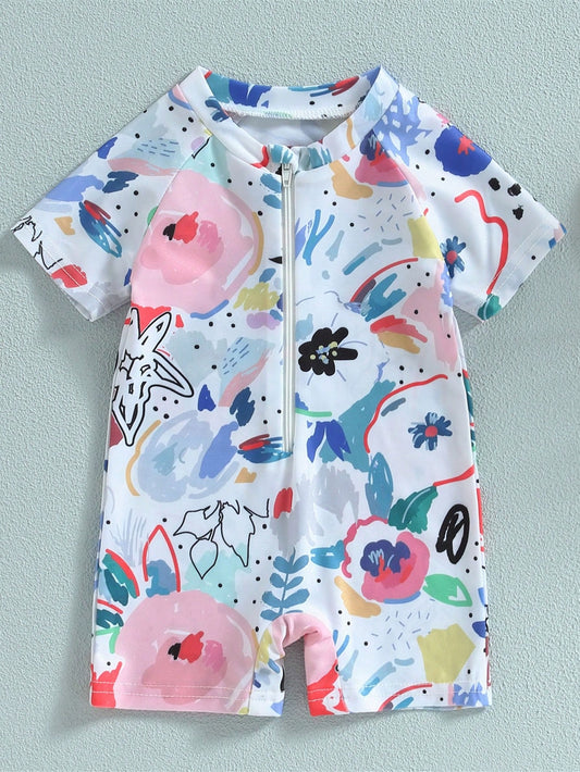 Traje de baño de protección solar con guarda erupción para bebé niña Playsuits Estampado acuarela con cierre de cremallera manga corta