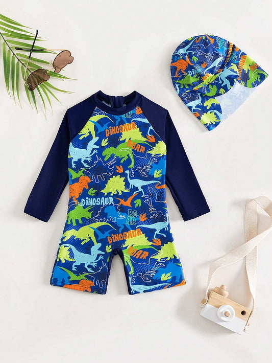 Traje De Baño Para Bebé Niño De Una Pieza Con Cremallera De Manga Larga Con Estampado De Dinosaurio Para El Verano, Incluido Sombrero De Sol