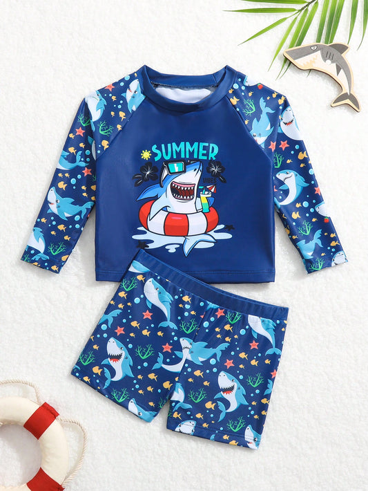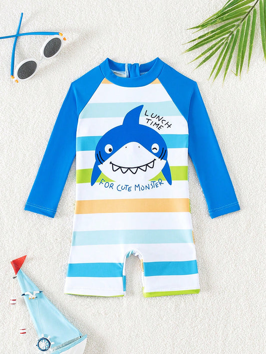 Traje De Baño De Una Pieza Para Bebé Con Lindo Patrón De Tiburón Impreso Y Sombrero, Protección Contra El Sol De Verano
