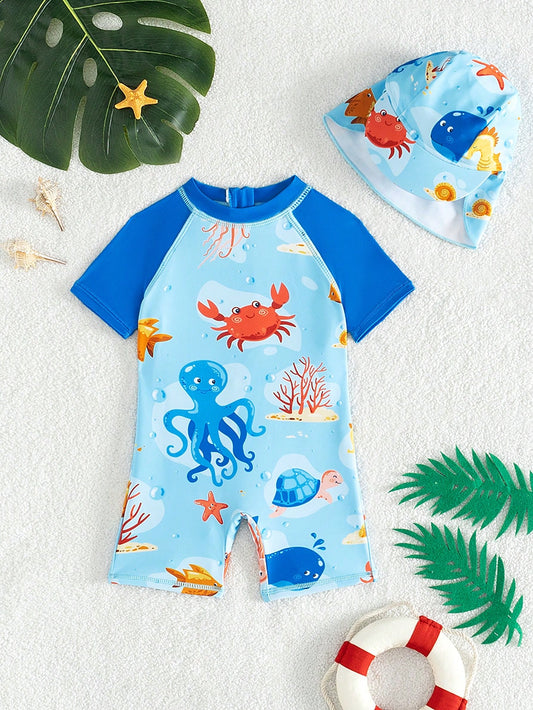 Traje de baño de una pieza para bebé niño con impresión de vida marina en bloque de color