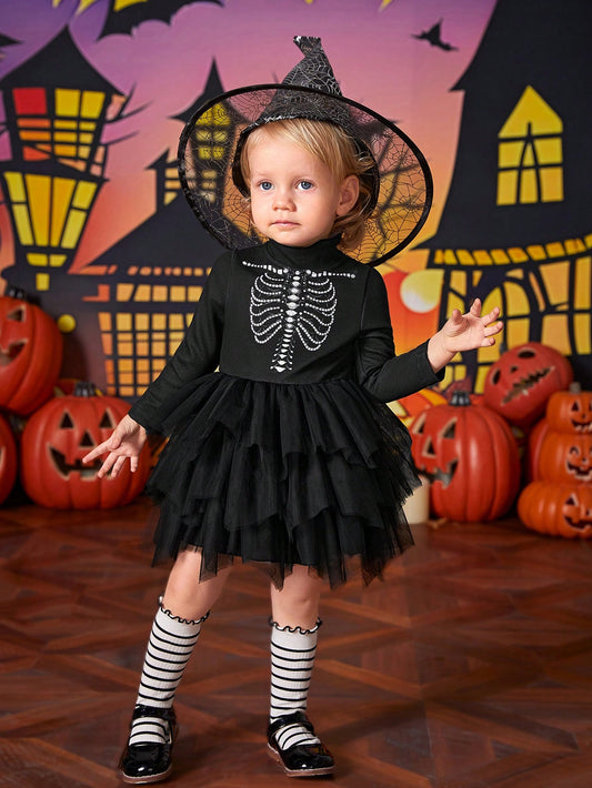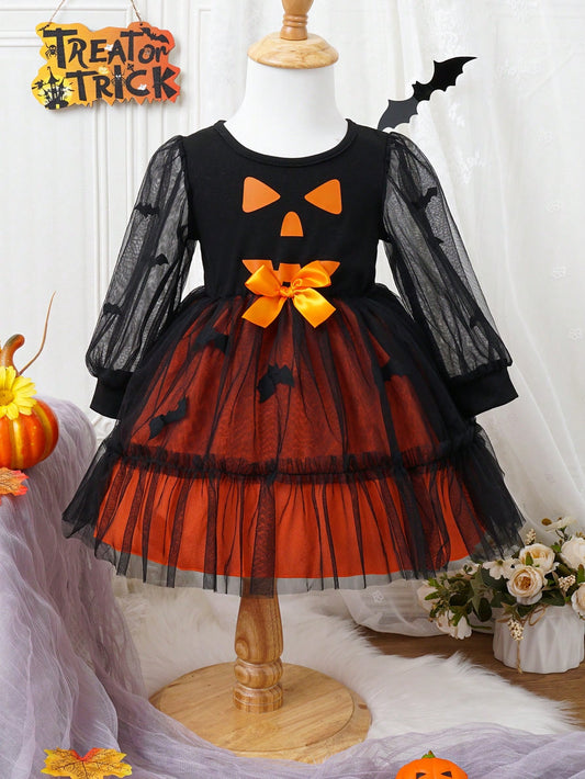 Vestido con superposición de malla con estampado de Halloween, lazo al frente, para niña, para fiesta de Halloween