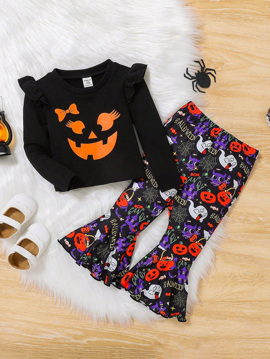 Bebé niña Camiseta con estampado de halloween ribete con fruncido & Pantalones acampanados