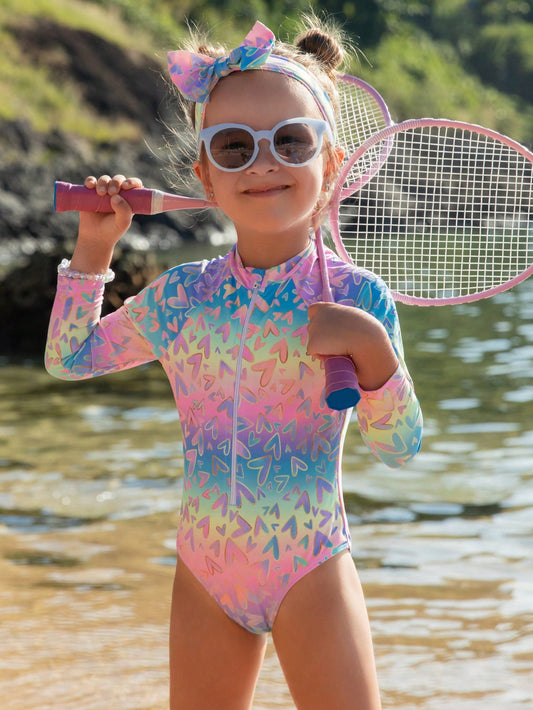 Traje de baño de una pieza con mangas largas y estampado de parchwork para niña preadolescente