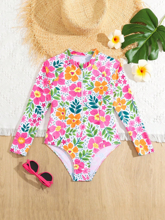 Traje de baño de una sola pieza para chica joven con diseño floral de manga larga al estilo de vacaciones