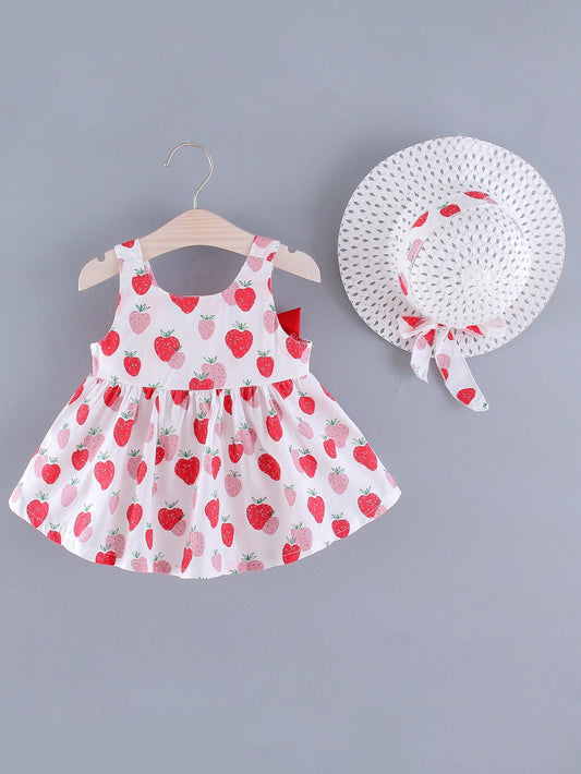 Bebé Vestido con estampado de fresa con lazo delantero con sombrero