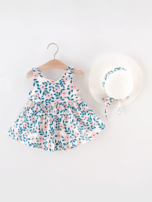 Bebé Vestido smock floral lazo grande trasero con sombrero