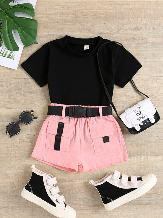 Niñas Camiseta de cuello redondo & Shorts con doble bolsillo con cinturón