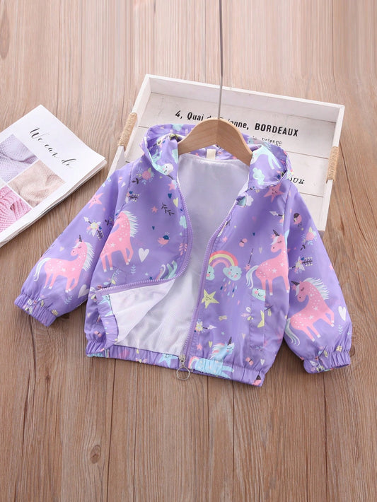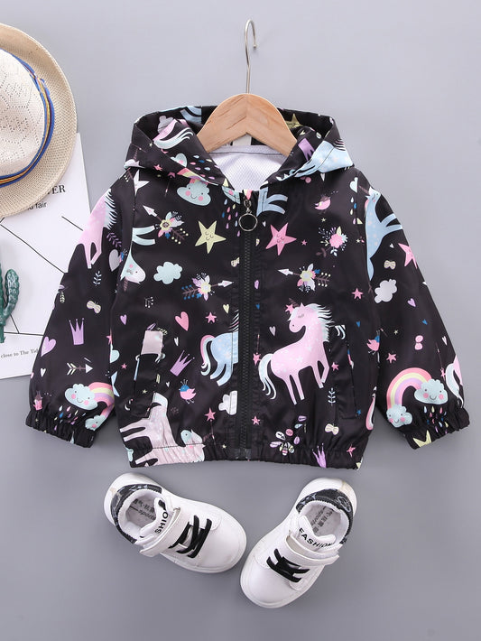 Niñitas Cazadora viento con estampado de unicornio de arcoíris con capucha