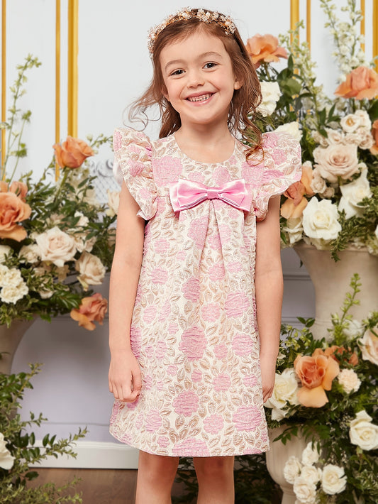 Niñas 1 pieza Vestido floral jacquard con lazo delantero ribete con fruncido