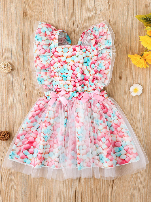 Niñas Vestido pichi con estampado de malla en contraste con lazo delantero ribete con fruncido