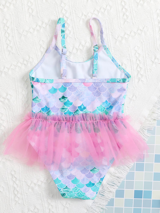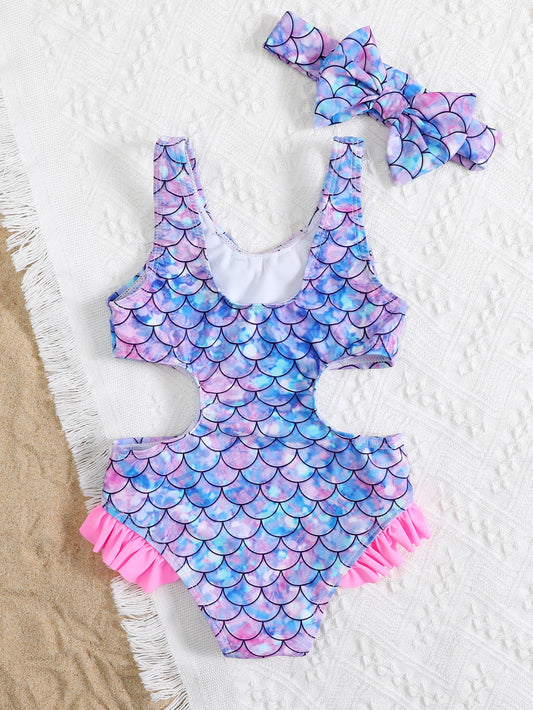 Niñitas Bañador una pieza con estampado de escama de pescado con abertura con banda de pelo