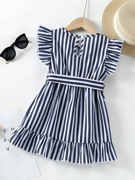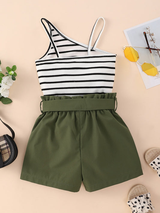 Niñitas de rayas de cuello asimétrico Top & de cintura con volante Shorts con cinturón