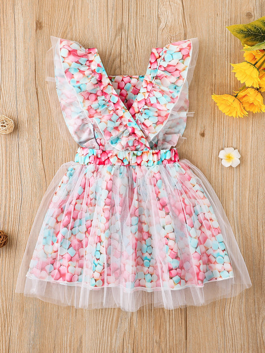 Niñitas Vestido pichi con estampado de malla en contraste con lazo delantero ribete con fruncido