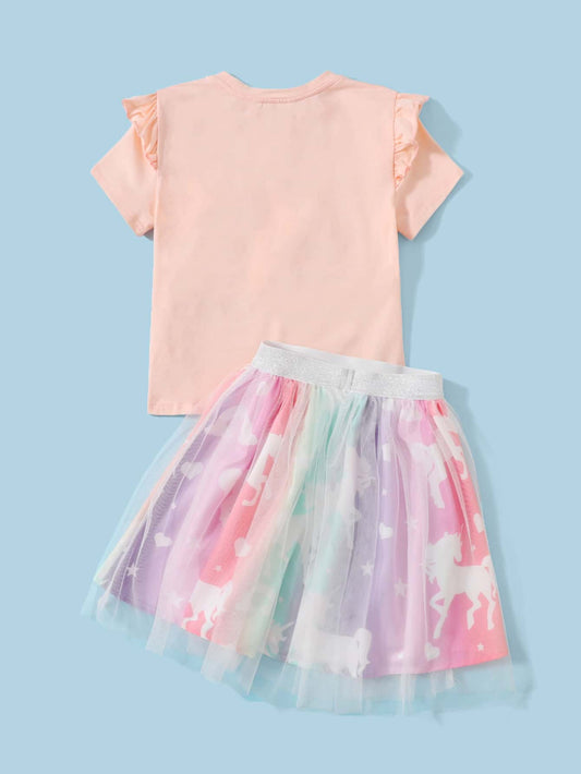 Conjunto camiseta ribete fruncido con estampado de unicornio con falda con malla