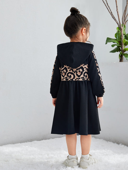 Niñas Vestido con capucha panel de leopardo de manga raglán