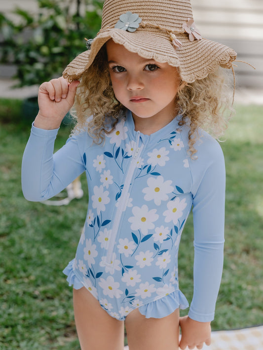Traje De Baño De Una Sola Pieza Para Niña Con Diseño De Flores, Ribete Con Volantes Y Cierre Frontal Con Cremallera