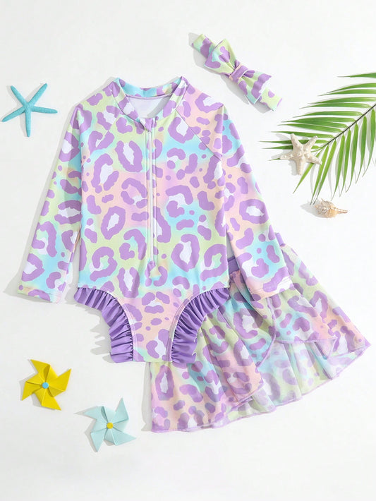 Niñas Bañador una pieza con estampado de leopardo con cremallera delantera con falda de playa con banda cabeza