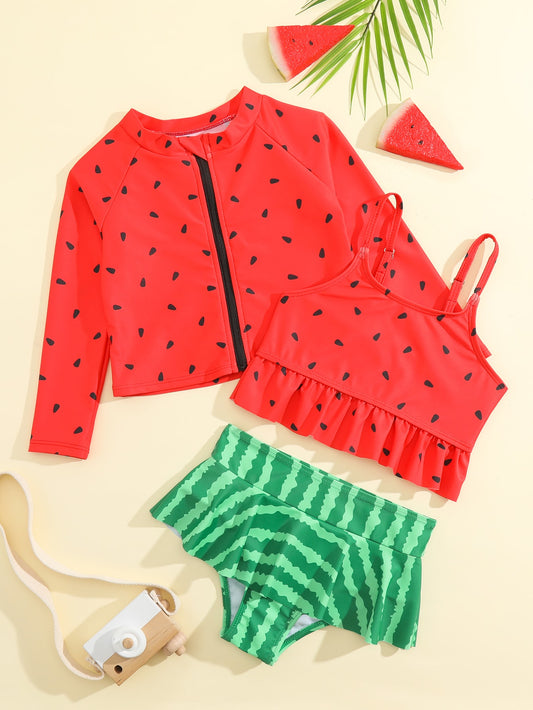 Bikini De Traje De Baño Para Niña Joven Con Diseño De Sandía, Borde Con Volante Y Parte Superior Con Cremallera