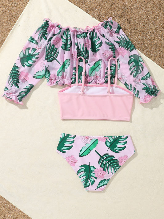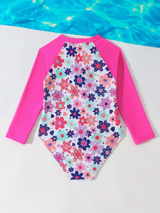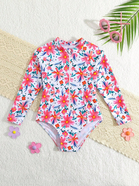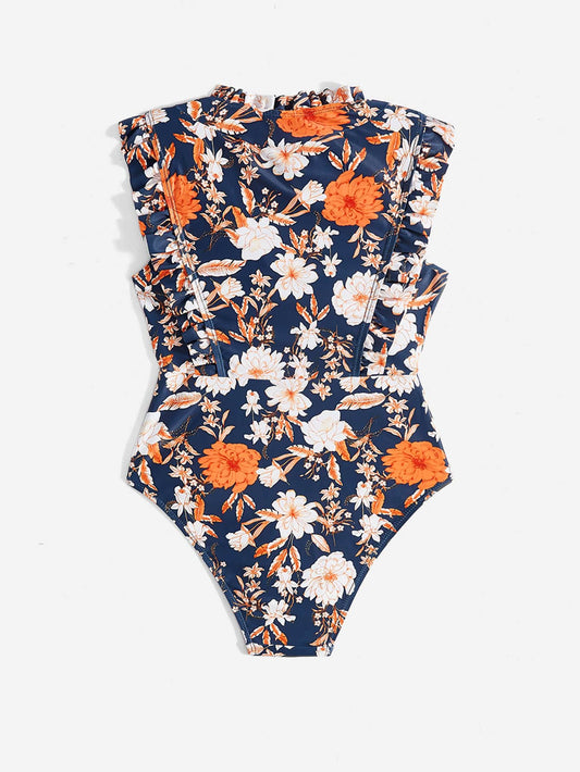 Niñas Bañador una pieza con estampado floral ribete con fruncido con cremallera delantera