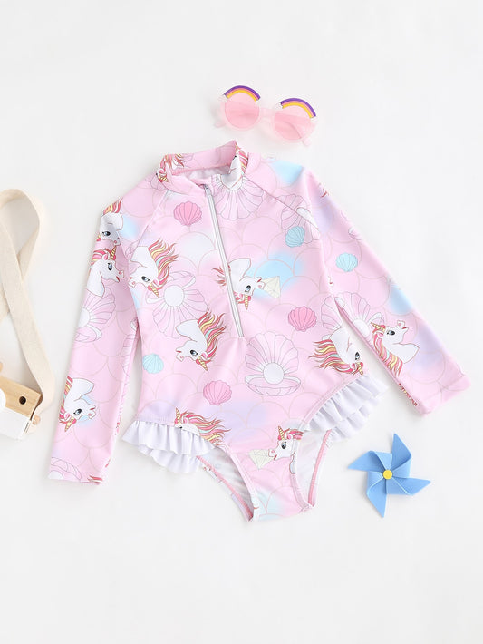 Traje de baño Estampado De Unicornio Y Volante Para Niña.
