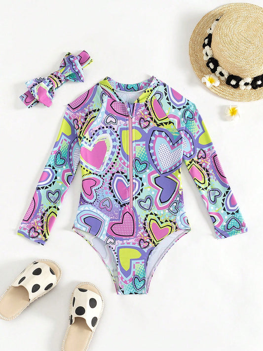Traje De Baño De Una Pieza De Manga Larga Para Niña Con Diadema Estampada