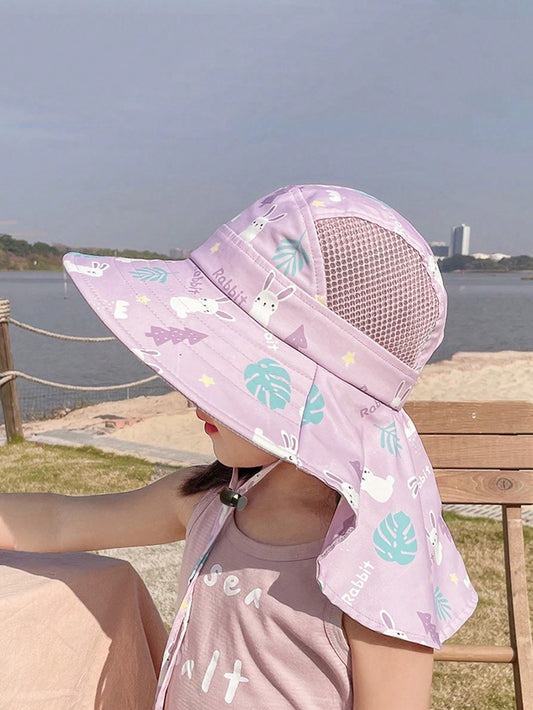 1 pieza Sombrero con chal anti-UV para niños con silbato desmontable, cordón ajustable, diseño de hoja de arce morada y conejo de dibujos animados, adecuado para niños y niñas, deportes al aire libre, playa