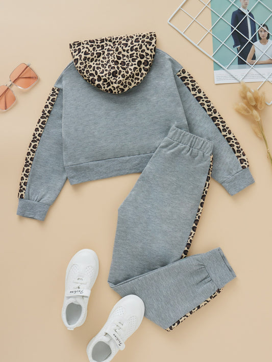 Niñas de leopardo con costura lateral en contraste Capucha & Pantalones deportivos