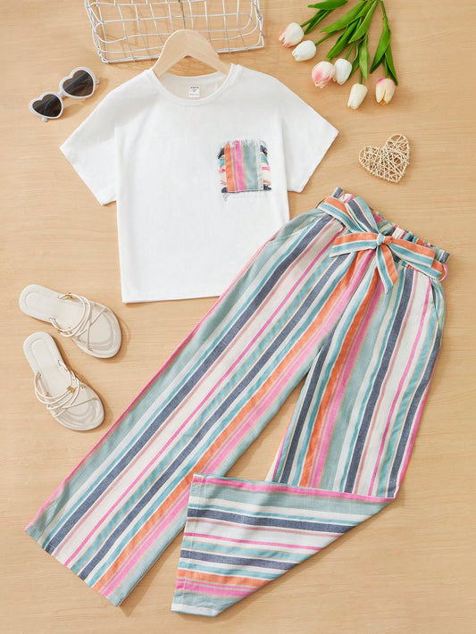 Chicas con estampado de rayas con parche de bolsillo Camiseta & con cinturón Pantalones